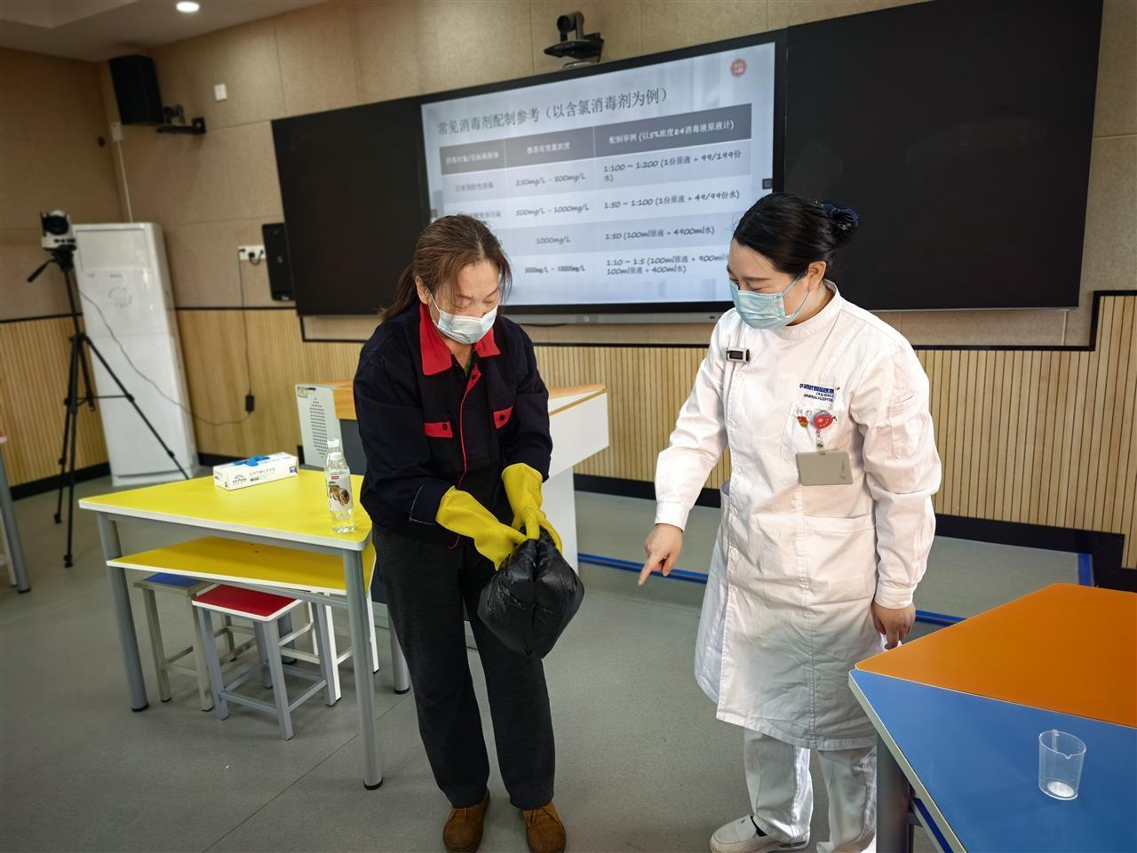 活动以“实用为先”,先通过通俗讲解普及流感、诺如病毒等常见传染病的传播途径与核心防控策略。实操环节中,社区卫生服务中心医护人员现场教学七步洗手法,引导师生同步练习;重点针对呕吐物规范处理、消毒水配比等校园高频场景,手把手指导保洁阿姨穿戴防护装备、规范清理流程,学生代表进行了演练并学习了疏散技巧。