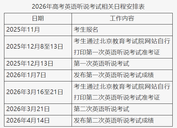 北京市高考英语听说考试采用计算机考试模式,实行一年两考。2026年第一次英语听说考试于2025年12月13日进行,第二次英语听说考试于2026年3月21日进行。