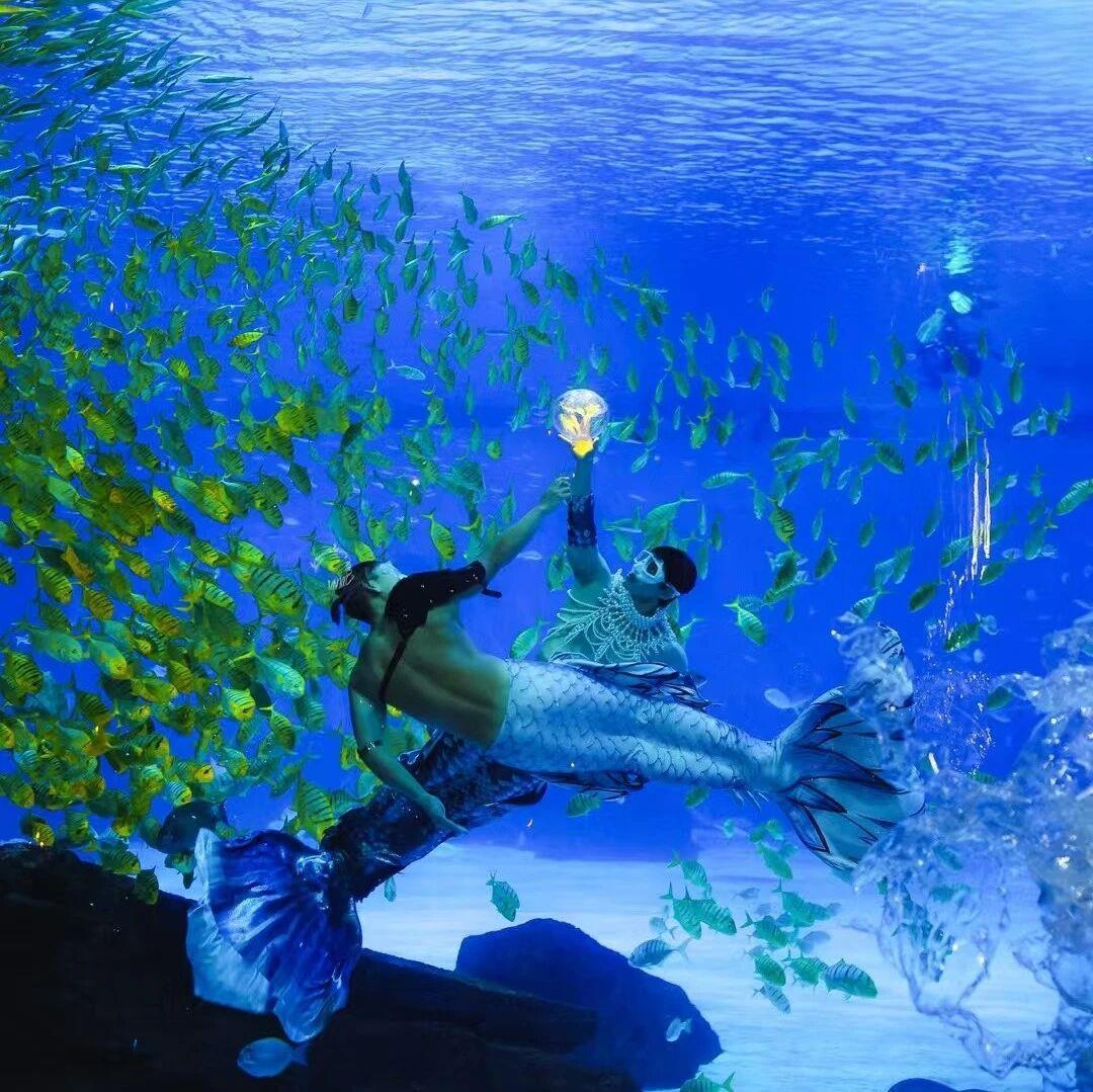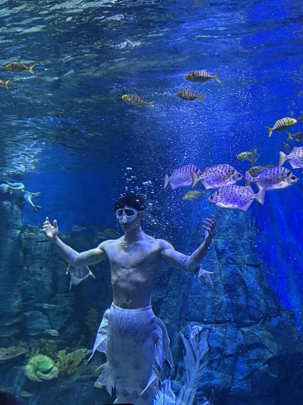 2023年,肖淞译偶然接触美人鱼表演,人生的齿轮再次转向。作为SSI/PADI双系统美人鱼教练,他坦言这条路上困难重重:“穿上鱼尾后,双腿被束缚,腰腹必须持续发力,每一次下潜都是对意志的考验。”