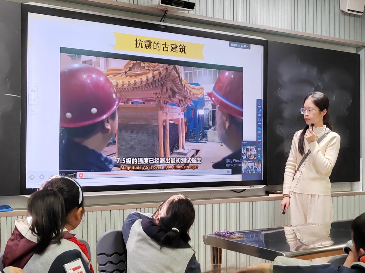 课堂上,谭思遥老师首先播放了一段“抗震的古建筑”模拟视频。视频中,当地震一级一级增加时,砖墙结构的房屋由摇摇晃晃到轰然倒塌,而榫卯结构的古建筑却依然坚固不倒。强烈的震感与两种结构房屋的抗震对比,瞬间激发了孩子们的热情,迫切想要了解神奇的榫卯技艺。