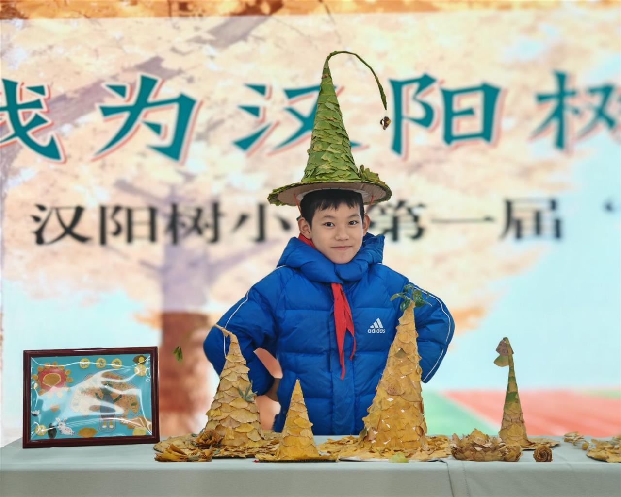 回到课堂,压叶、修剪、分拣等工序有条不紊地进行。有的孩子将深浅不一的银杏叶层层叠加,勾勒出校园与汉阳树的轮廓,叶脉的纹路成了画作最自然的线条;有的则发挥巧思,把叶片折出褶皱做成“公主帽”的花边,将碎叶拼成星星图案点缀“魔法师礼帽”,每一片落叶都在孩子们手中焕发新生。六年级学子更是交出“重磅作品”——以1:1比例复刻的汉阳树公园模型,从古树形态到周边景致都栩栩如生,尽显匠心。