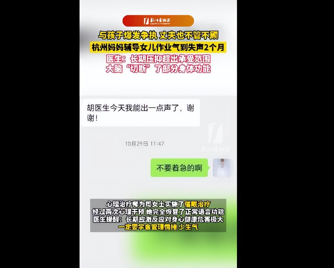 到杭州市第一人民医院检查后,确诊为分离(转换)障碍——一种因心理因素导致的功能性嗓音障碍。医生解释:“当长期压抑的情绪超出承受范围,大脑可能会‘切断’部分身体功能,就像有人在巨大压力下失声一样。”心理治疗师为周女士实施了催眠治疗。最终经过两次心理干预,她完全恢复了正常语言功能。医生提醒:长期应激反应对身心健康危害极大,为了自己,一定要学会管理情绪,少生气。