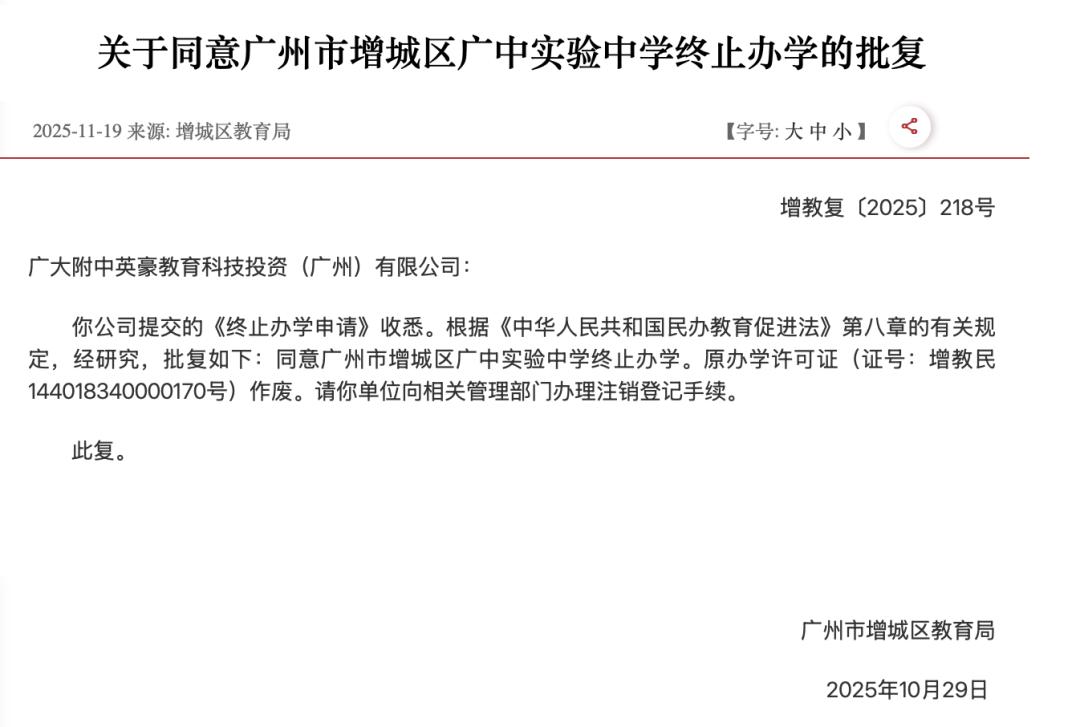 11月19日,广州市增城区教育局发布了关于同意广州市增城区广中实验中学终止办学的批复。