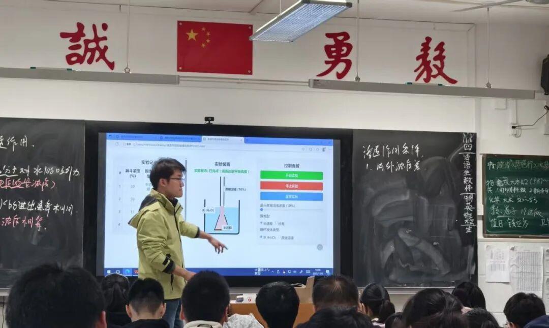 这是生物教师陈枫《渗透作用的多维度解码》课堂的起始一幕。他从实体实验入手,让学生亲手操作经典的渗透装置,观察半透膜内外液面的真实变化。随后,课堂转入数字化环节——大屏幕上,一个由陈枫用DeepSeek自主开发的AI模拟实验程序启动,学生可通过滑块调节蔗糖浓度,从10%到50%实时变化;还能选择半透膜或纱布,甚至将烧杯中的清水换成不同浓度的蔗糖溶液。
