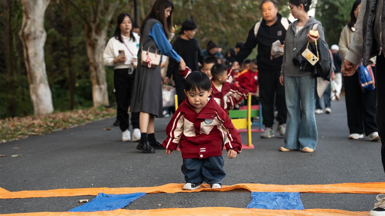 手持“秋日寻宝图”,亲子家庭开启自然探索之旅:寻觅鸟类雕塑、辨识特征,驻足桂花树下感受芬芳,捡拾各色落叶比拼“色彩收集”。徒步途中设置的“穿越时空隧道”“独木桥过河”等四大关卡,让孩子们化身“勇敢小战士”,在家长的加油声中勇敢闯关,公园各处回荡着欢声笑语。