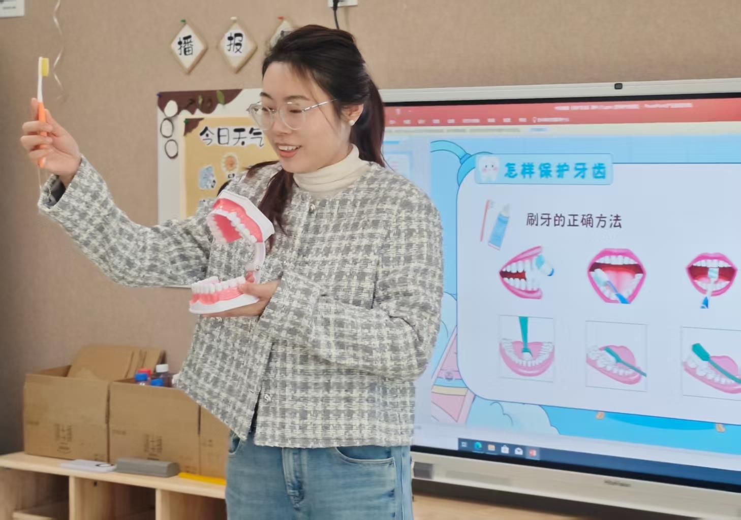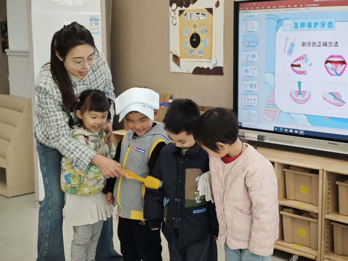 到了实践环节,小家伙们早已跃跃欲试。他们人手一套真实的牙刷和仿真牙齿模型,在牙医阿姨“小圈刷、来回刷”的耐心指导下,化身认真的“牙齿小卫士”,有模有样地动手操作起来。