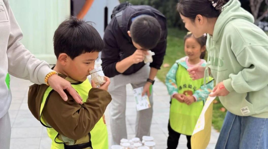 在“气味小侦探”点位,一排排小罐子里装着不同的中草药。家长拉着孩子凑近闻一闻,猜猜罐子里装的是什么药材。只要猜对3种,就能成功盖章。现场时不时传来孩子们兴奋的欢呼声:“我猜对啦!”