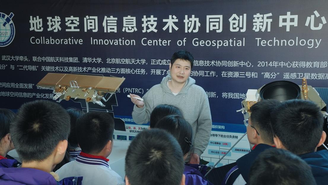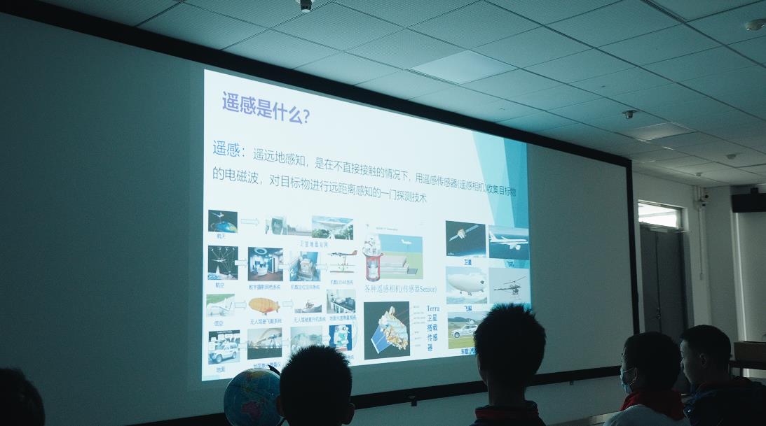 在科普活动室,武大地面站达风副研究员做报告。他向学生介绍我国系列遥感卫星的发展情况,深入浅出地将遥感在国家安全、生态环境保护、医疗健康中发挥的作用讲给学生,生动的遥感应用案例引导学生感受遥感测绘技术的价值与意义。