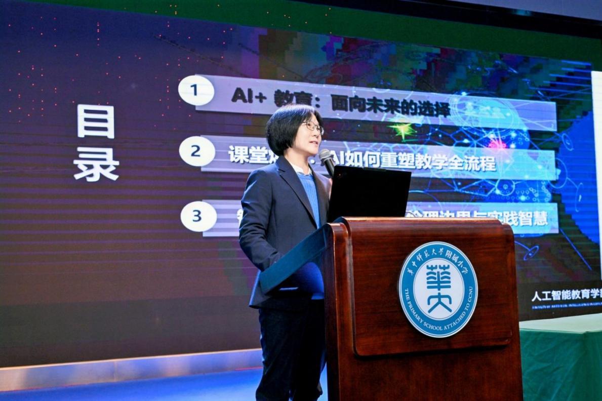 开幕式后,华中师范大学教授、博导张屹带来《AI进课堂:大模型如何构建课堂教学新图景》专题报告。报告围绕“AI+教育:面向未来的选择”“课堂焕新:AI如何重塑教学全流程”“智行有度:教育AI的伦理边界与实践智慧”三大维度展开,以专业理论为支撑、实践范例为依托,深入浅出地解析了技术与教育的融合逻辑,让在场同仁对“课程育人”与“数智赋能”的深度融合有了更为清晰、深刻的认知。