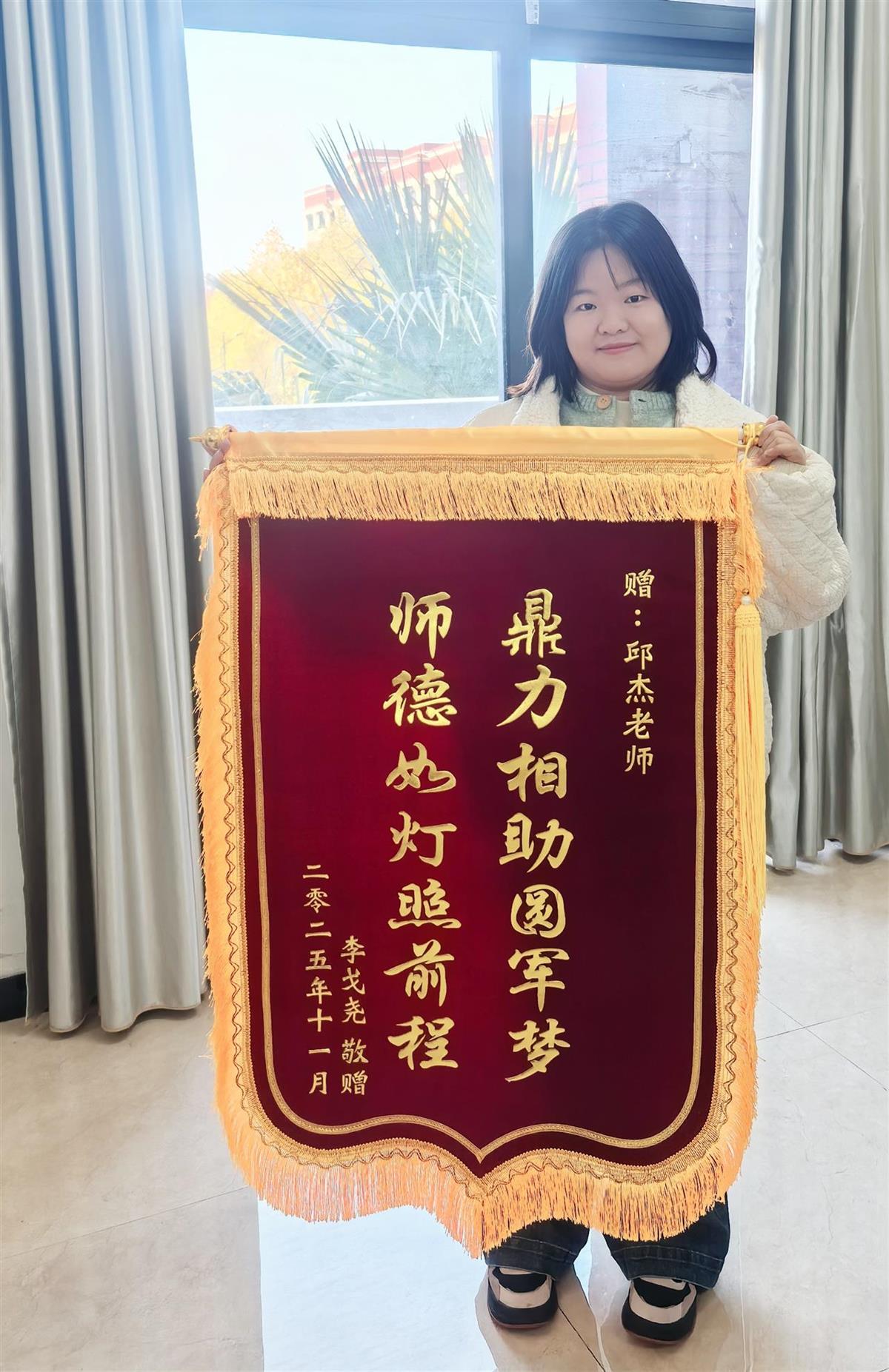 如今,李戈尧已如愿入伍。他的父亲送来锦旗时激动地说:“孩子当初犹豫不决,是邱老师一次次谈心,讲政策、做规划,帮他坚定了决心。孩子穿上军装后,还说要特别感谢邱老师!”锦旗熠熠生辉,承载的不仅是家长对辅导员付出的认可,更是对学校育人工作的信任。