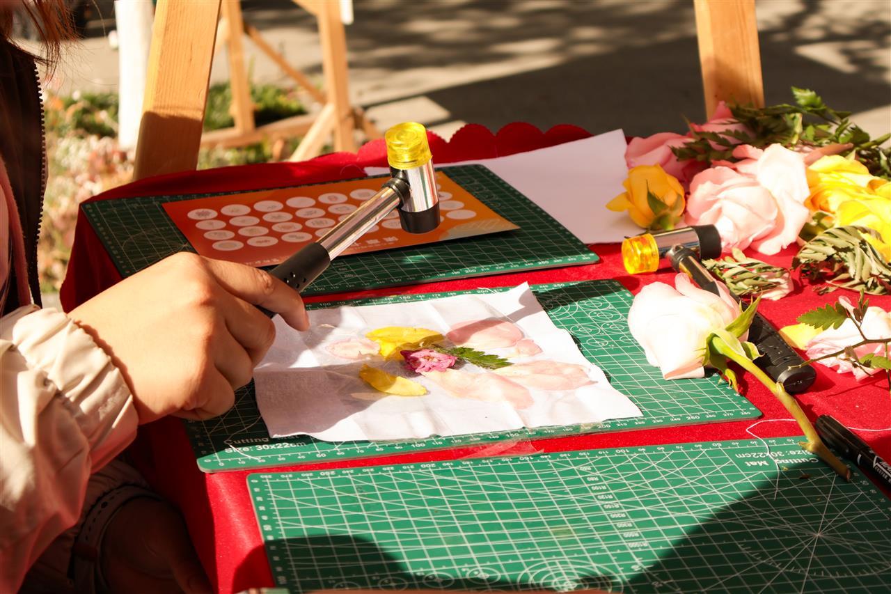 “掌握好力道,颜色才能晕染得更自然!”11月29日,湖北大学“美续华章”美育开放日活动开幕,在“植物印染,与植物同呼吸”摊位前,参与者手持小锤子反复敲打,植物的色彩慢慢印染在专属帆布袋上。