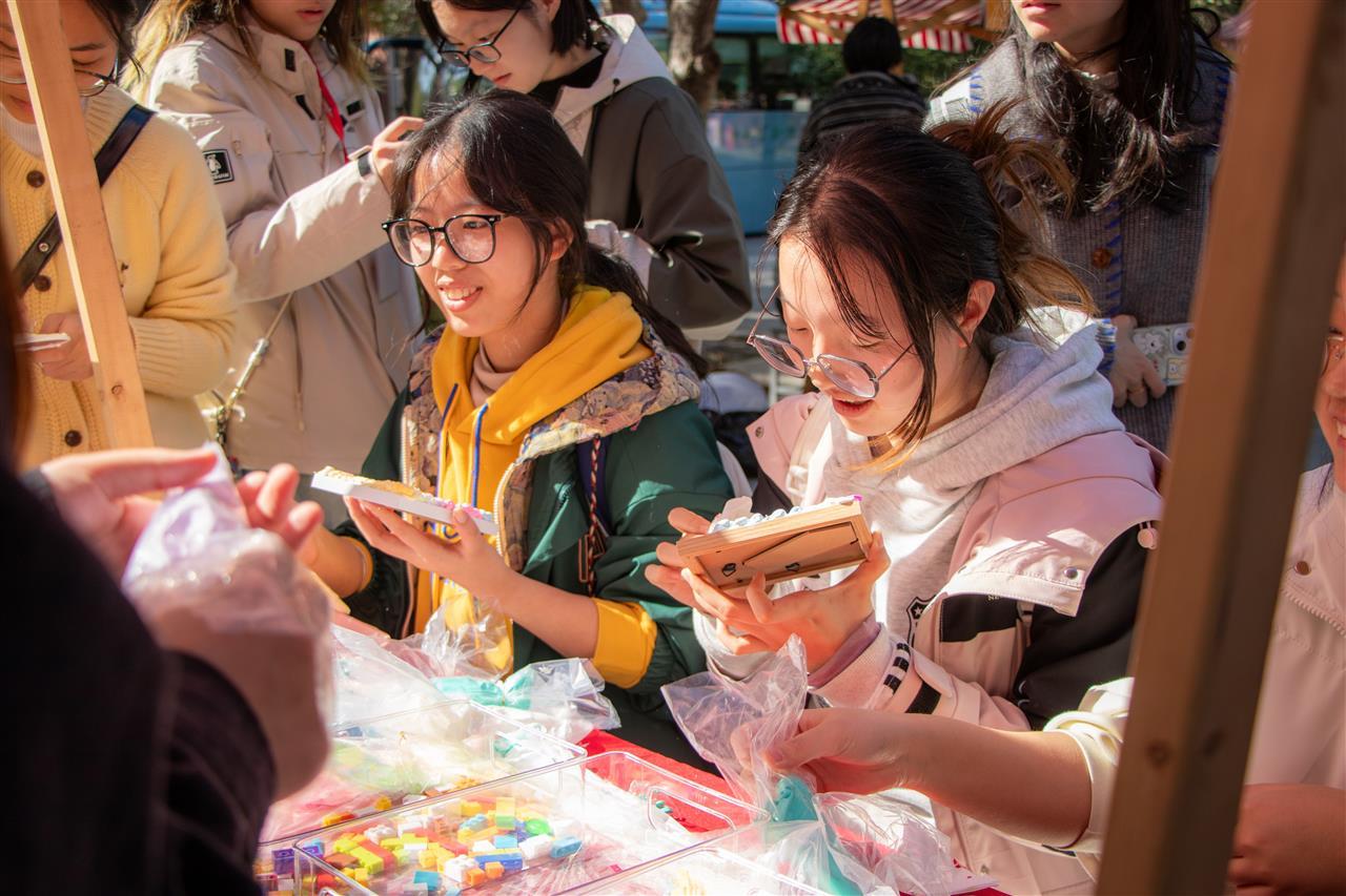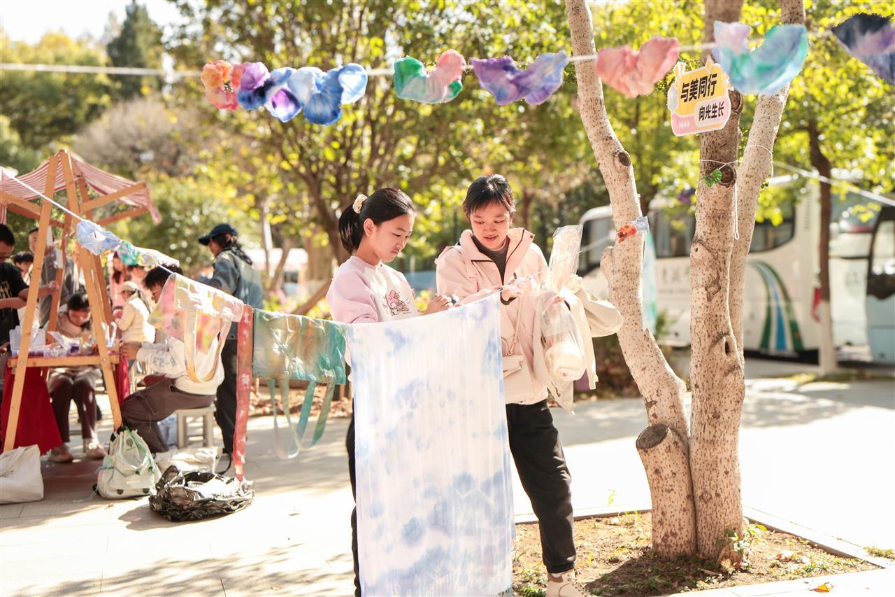 此次美育开放日以“艺术疗愈”为主线,结合沉浸式互动体验,打造出一场“可观、可感、可参与”的美育实践。现场32个创意摊位呈双环形依次排开,涵盖植物印染、非遗手作、饰品DIY等多个门类,让师生在感受技艺碰撞的同时,舒缓身心、涵养性情。