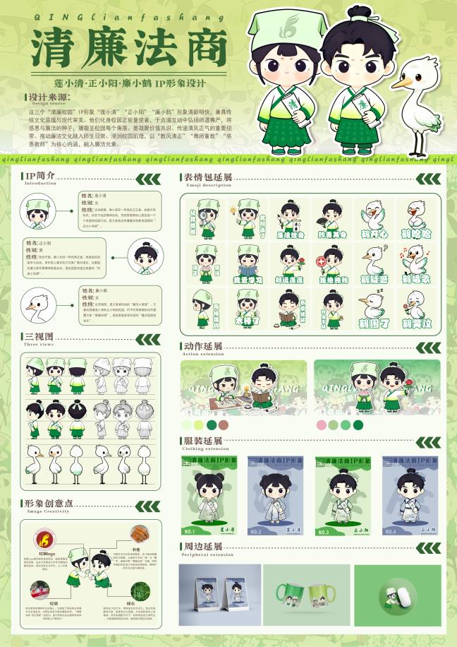 另一组获奖IP形象《莲小清·正小阳·廉小鹤》,由学生白佳丽、淡婧将“明德尚学、笃行致新”的校训精神与白鹤、书简等廉洁意象相融合,衍生出表情包、鼠标垫、水杯、台历等系列文创,让清风正气以轻松活泼的方式融入校园生活。