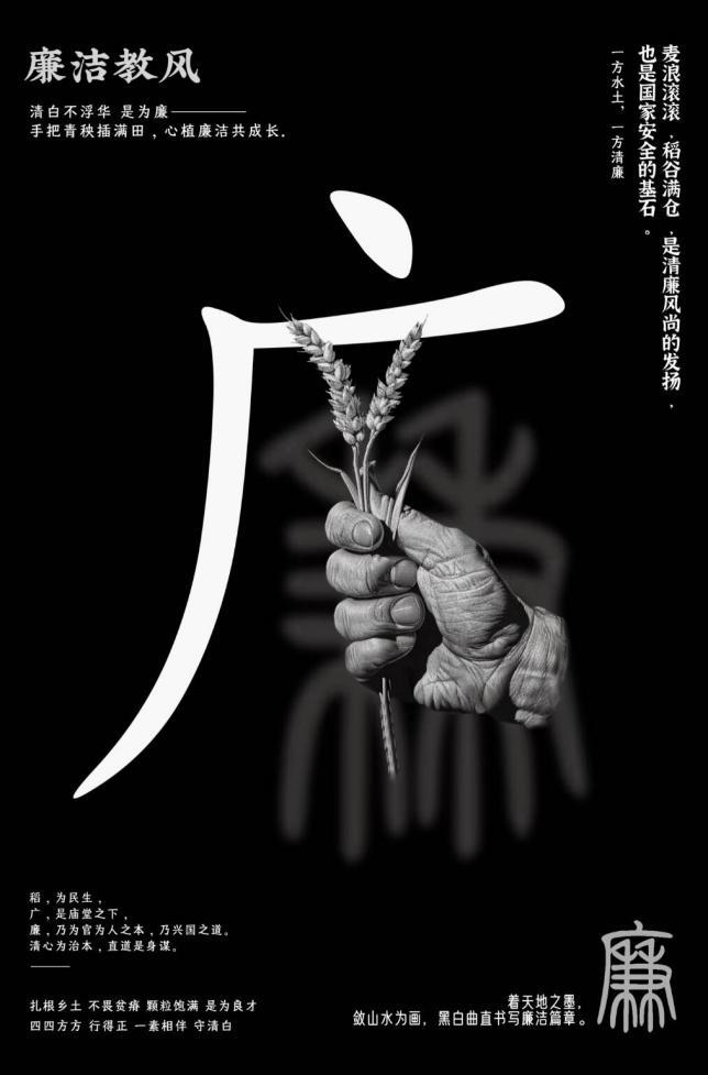 “这个设计把汉字的意境用活了!”在作品《清正廉洁·中国家风》前,常有师生驻足品味。作者李若希巧妙拆解“廉”字:“广”字化为家屋轮廓,喻示家风传承;“兼”字变形为手捧双禾,象征“以禾喻民”,整体黑白配色传递出清廉本色。