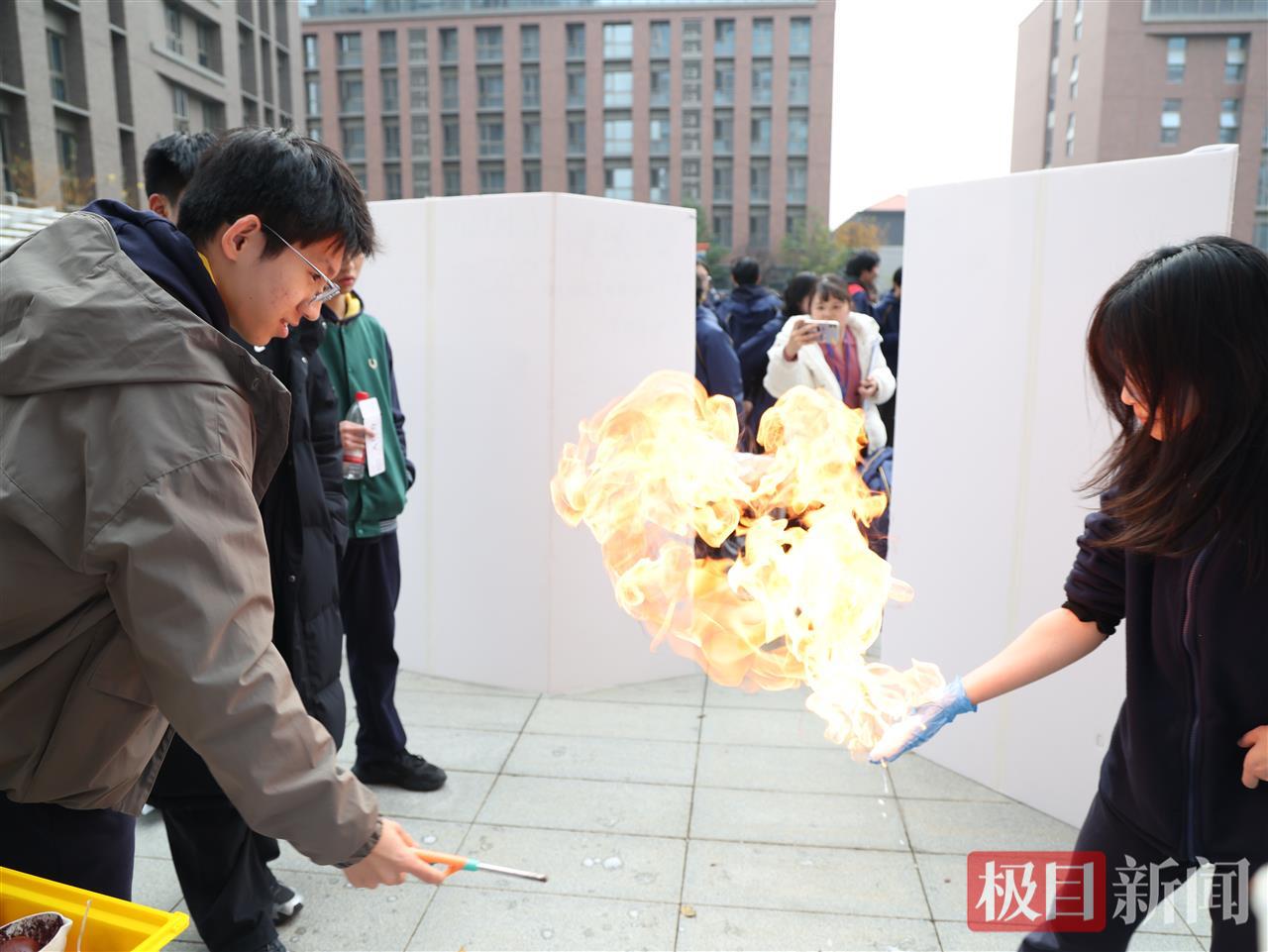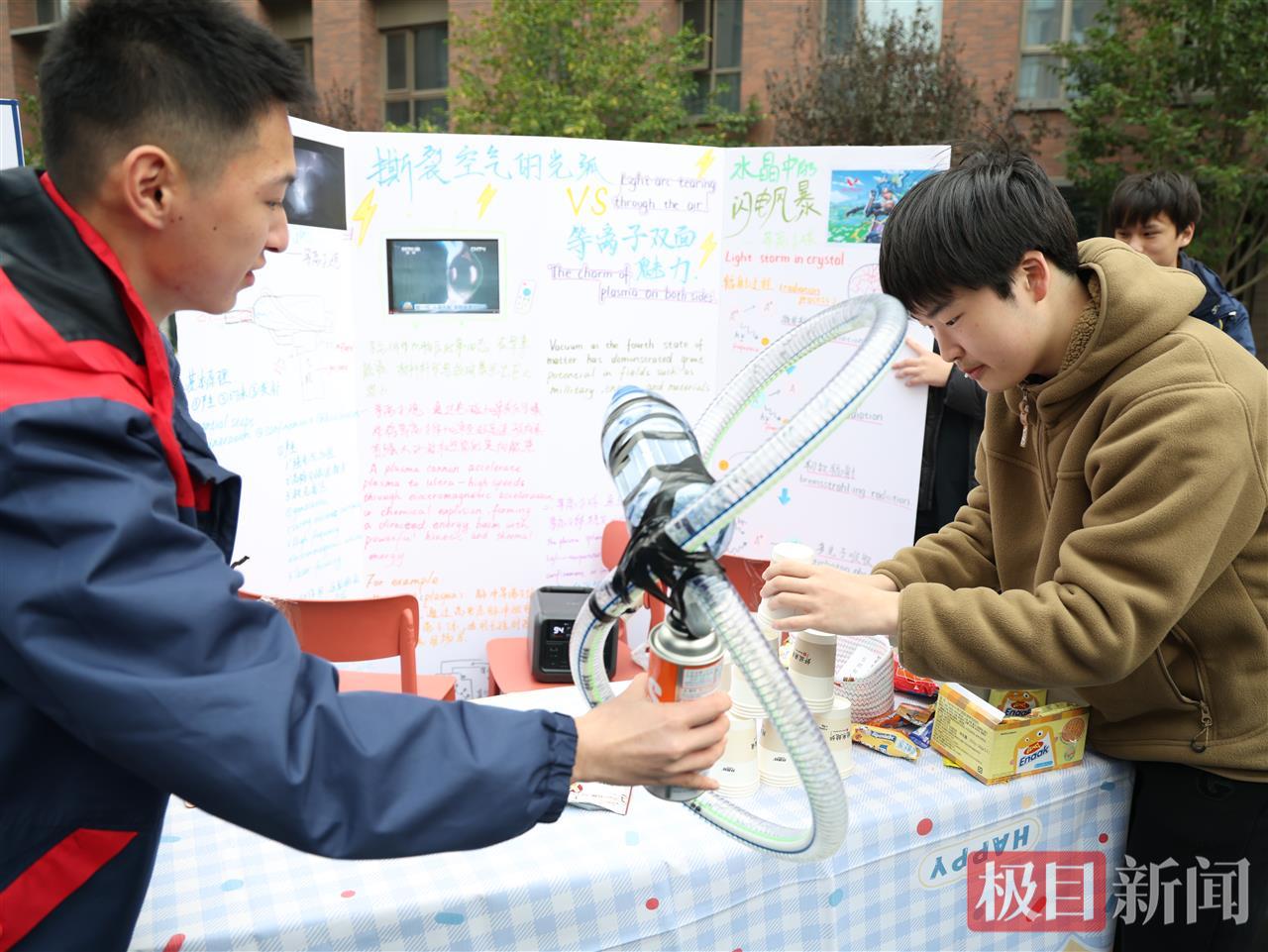 沿着校园展区走过,会写书法的机器人、自制等离子炮、机械蝴蝶依次陈列,科技创造、历史文化、化学材料、环境保护等主题在学子手中化为可触摸的创意发明。而在绿茵草地上,一场模型飞机起飞实验正在上演——“3、2、1,起飞!”伴随着发动机的轰鸣,一架写着物理老师名字“Rossi”的模型飞机借风腾空,引来阵阵欢呼。