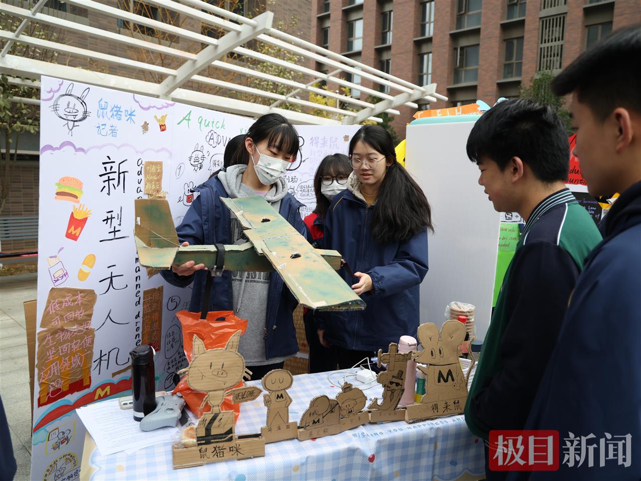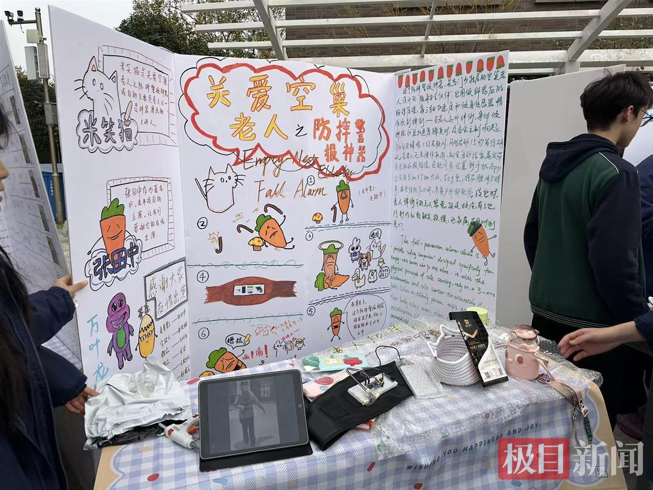 科技项目关注人文,人文项目也紧扣时代。现场,学生对“泡泡玛特经济”开展调研,用经济学模型解析盲盒消费心理;也有团队为独居老人设计防摔报警腰带——内置倾斜角度传感器,跌倒后0.3秒内触发警报,并同步在小程序通知家人。“灵感来自家中长辈独自在家时突发中风的经历。”高二(18)班郭同学说,制作这一报警器,从查资料、看视频到向老师请教,制作过程虽仅耗时一周,却满是挑战。“我们不断调试,还为充电装置加了固定口袋,既要保护老人,也要产品耐用。”