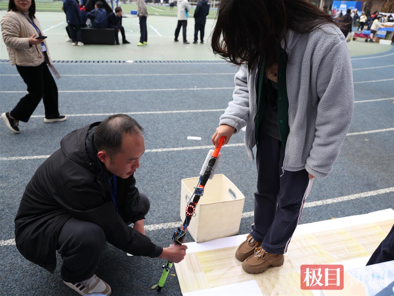 现场展台上,一根缠着电子元件的盲杖引起众人体验。参观者闭上双眼,握杖探路,遇到障碍物时,盲杖自动语音提醒。这是高二(16)班严同学团队的成果。“我在网上认识了不少视障朋友,他们既有过车祸经历,也有过被绊倒的经历。”严同学说,许多视障者不敢出门,是因为“看不见别人,有时别人也看不见他们”。