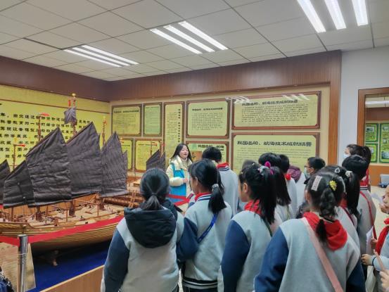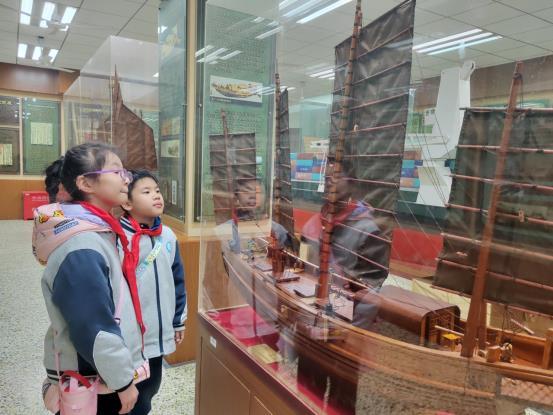 在武汉理工大学船海与能源动力工程学院大学生志愿者的带领下,钢都小学的同学们依次参观了四大主题展区。战国时期的大翼,东汉、三国时期的斗舰,唐代的海鹘战船,明代的漕舫等历代的名船名舰,牢牢吸引了同学们的目光,大家啧啧称赞,“晋代八槽舰的水密隔舱是最早可以保证船舶航行安全的技术”,“五牙舰战斗力很强!”