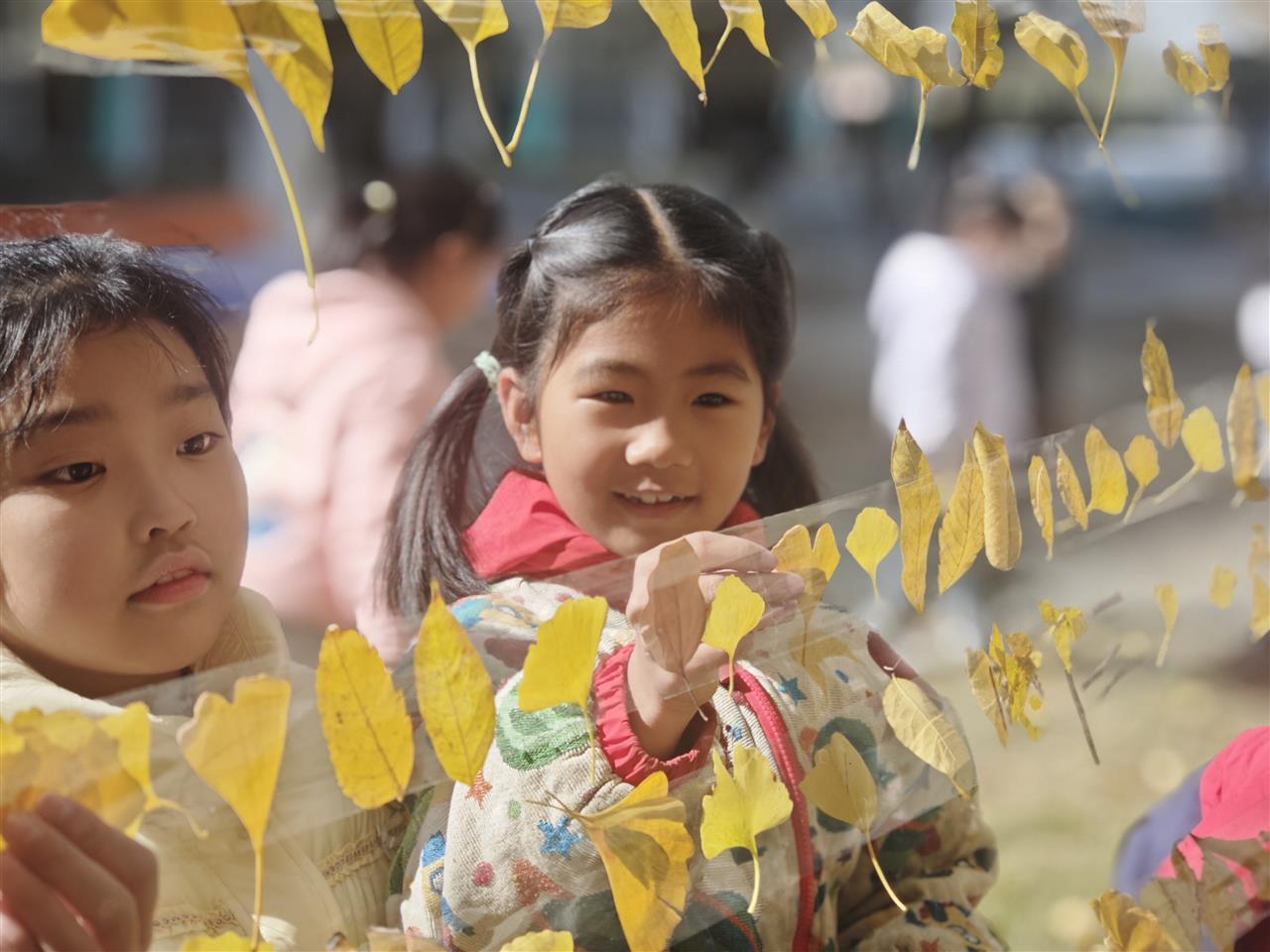 课间时分,校园里的林荫道、花坛边化身欢乐的探索乐园。队员们暂时放下课本,化身“小小拾叶者”,带着好奇与期待穿梭其间:有的小心捡起银杏的金黄扇形叶片,有的细心收集栾树叶的羽状复叶,不时交流着发现的惊喜:“你看这片栾树叶像不像羽毛!”“银杏叶掉在地上像铺了层金子!”大家小心翼翼地捧着收集到的树叶,纷纷来到展示墙旁,将亲手寻得的“宝贝”仔细贴在透明胶带上,一片片形态各异的树叶在树间串联成景,成为校园里一道独特的秋日风景线。