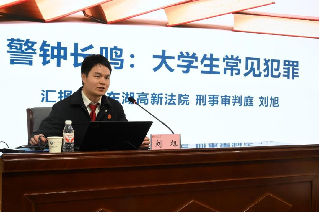 武汉东湖新技术开发区人民法院法官助理刘旭带来的“案例式”普法,让在场师生直呼“听得懂、用得上”。“宪法从不是挂在墙上的条文,而是管日常的‘硬规矩’。”刘旭以《警钟长鸣:大学生常见犯罪》为题,避开空洞说教,用11个真实案例“现身说法”。从帮同学代考触犯刑法,到利用技术漏洞盗取信息发送骚扰短信的网络犯罪,再到宿舍冲突升级为寻衅滋事,这些涵盖考试作弊、网络诈骗、危险驾驶等10类高频风险的案例,把法律红线具象化为可感知的校园场景。