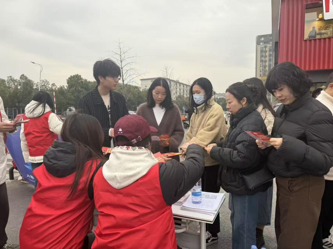 12月4日,国家宪法日当天,武汉学院枫桥法翼先锋队携手江夏区公安分局大桥派出所、江夏区经济开发区司法所、江夏区消防救援大队,于当日上午在江夏区欧亚达广场共同开展“宪法护航平安社区警务为民共筑和谐”主题宣传活动。红色志愿马甲与“枫桥法翼先锋队”队旗交相辉映,专业的法律讲解、丰富的互动体验、贴心的便民服务,让法治温度浸润基层角落,让宪法精神与安全常识真正走进群众心间。