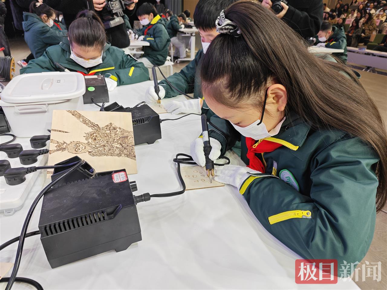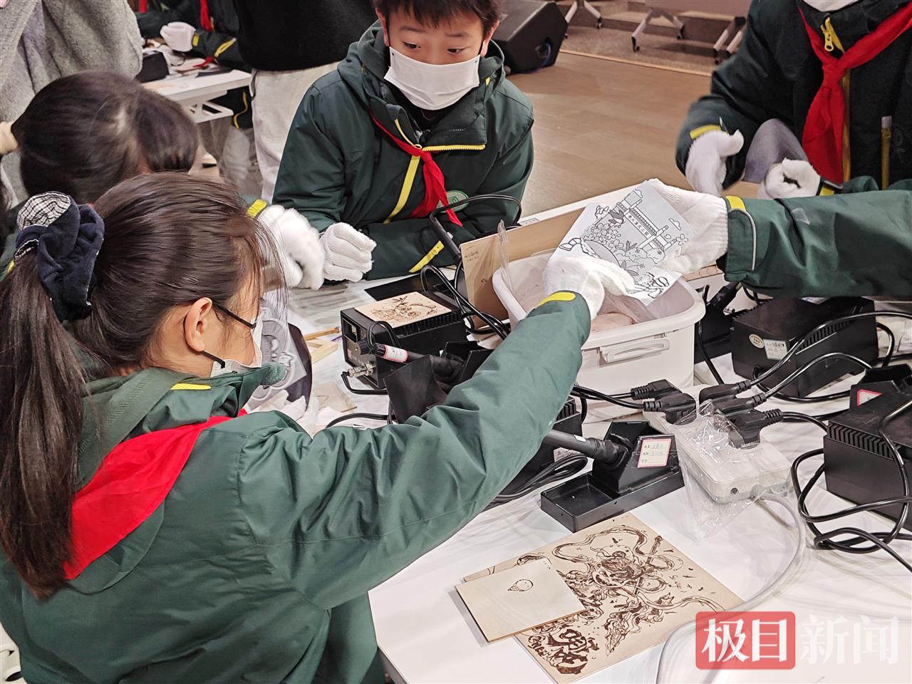 在教学中,金老师通过设计“做中学、学中思”的实践路径,让学生在“大江大湖大武汉,一笔一烙绘江城”主题中,运用AI设计图稿,融入武汉美食、建筑、方言等元素,为传统烙画注入时代内涵。