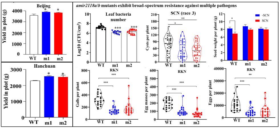 据介绍,微小RNA 是一类调控基因表达的小分子非编码 RNA,对调控作物生长发育及农艺性状研究具有重要意义。以往研究多聚焦于微小RNA 的功能,对与它相伴产生的另一类互补 RNA 链的研究较少。团队通过研究发现,利用基因编辑技术敲除大豆中代号2118的微小RNA的互补链,可以促进产量和抗病性相关基因的表达,从而实现大豆产量与广谱抗性的协同提升,为作物产量和抗病性改良提供了新策略。