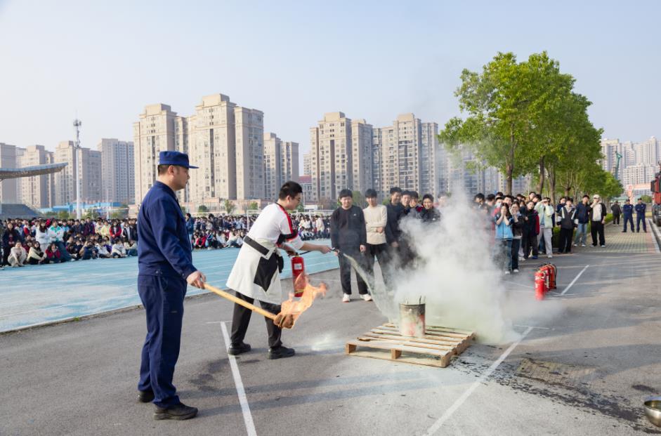 此次演练的重头戏,当属金港消防中队官兵带来的“消防知识盛宴”。消防员们手持灭火器,详细讲解着灭火器的使用方法。“一提二拔三握四压”,简洁明了的口诀,配合着现场演示,让师生们瞬间掌握了灭火的关键技巧。随后,同学们纷纷踊跃上前,亲身体验灭火操作。当白色的灭火剂从灭火器中喷出,精准扑灭火焰的那一刻,现场爆发出阵阵惊叹声。