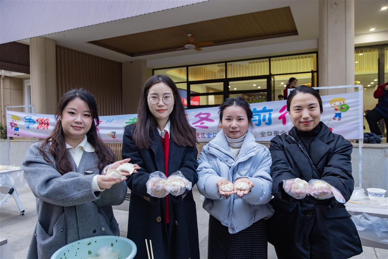 令人惊喜的是,这场校园活动很快“破圈”,原本只是散步经过的爹爹婆婆们也纷纷驻足,饶有兴致地主动加入,成了现场最受欢迎的“技术指导”。“孩子们,馅料要放中间,捏边要沾点水才紧。”她们手法娴熟,一边麻利地示范着,一边笑着讲述自家包饺子的“秘诀”。邻里长辈的加入,瞬间让现场变成了一个跨越年龄的欢乐课堂。学生们从最初的生疏忙乱,到逐渐上手,一盘盘形状各异的饺子陆续完成,有的还创意十足地包出了各种花样:“元宝”“睡饺”“圆饺”,还有人举起了手里的“巨无霸饺子”向大家炫耀,引起哄堂大笑。