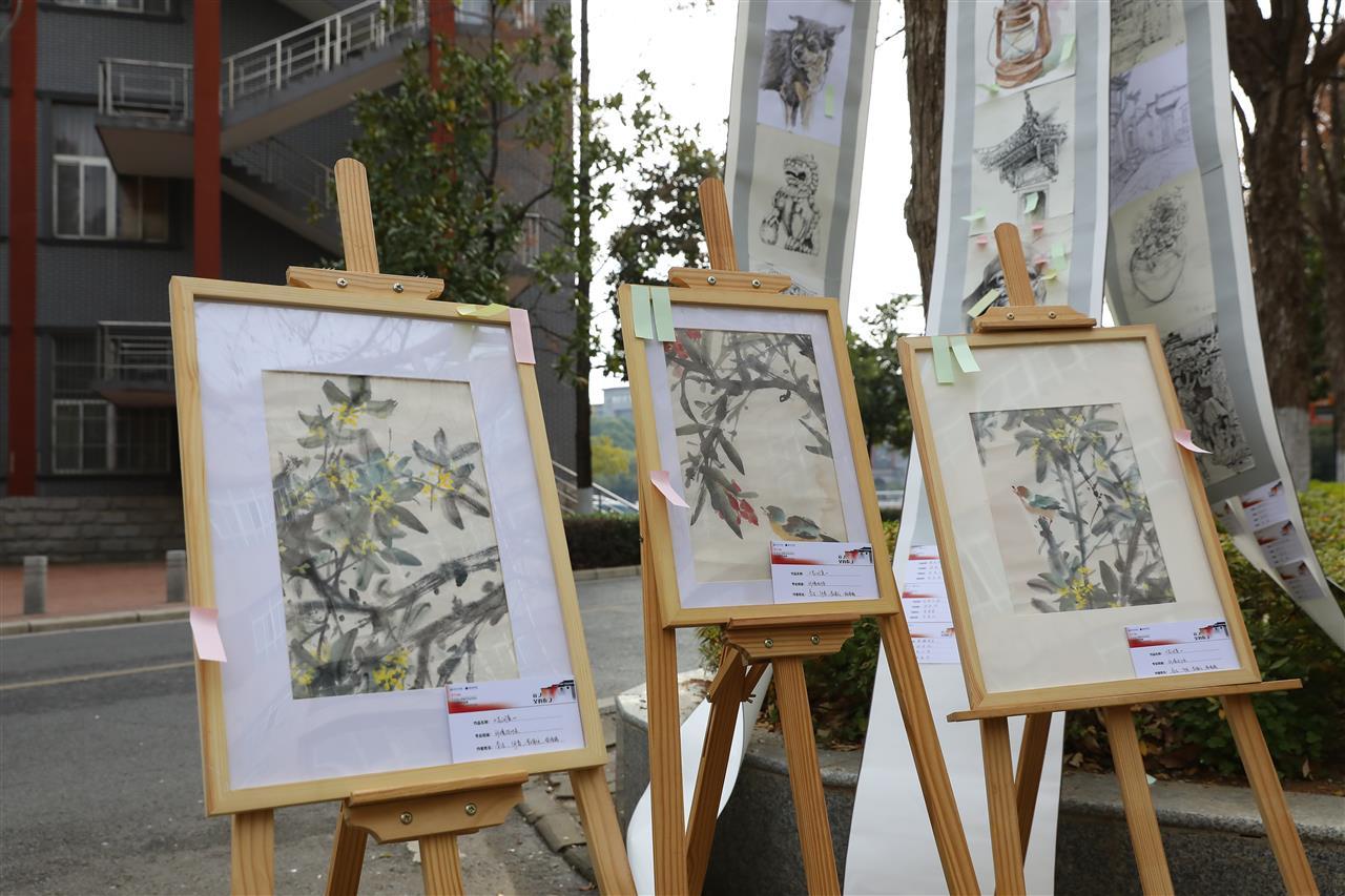 展览现场,作品以卷轴、画架及立体装置等形式呈现,与树木、廊道自然融合,营造出移步换景的沉浸氛围。其中,水彩作品《鱼趣》以池中锦鲤为题,通过黑白对比与光影刻画,在静态中捕捉生机,引发观众对自然灵动的无限遐想。师生们穿行于作品之间,不时交流构图匠心与表现手法。
