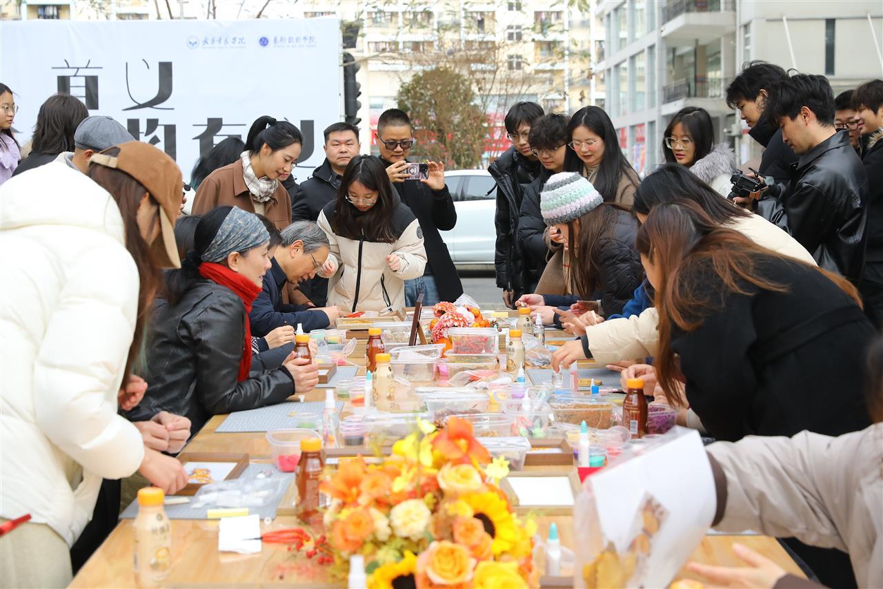 本次展览特别设置“拾秋·手艺共创”互动环节。师生先通过“拾秋”收集落叶、松果等自然素材,再结合写生画稿,运用非遗工艺“掐丝珐琅”进行再创作,让江南意蕴在指尖绽放。