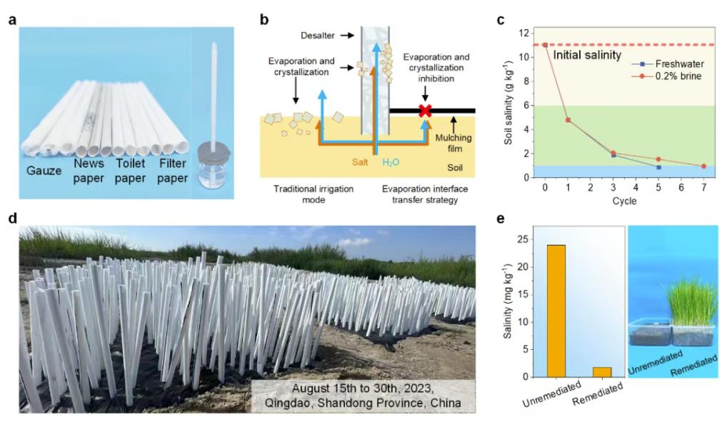 而这些效果的实现,背后仅需一根吸管。团队历时两年时间,利用简单易得的滤纸、吸管、地膜构建了废水零排放的非接触式太阳能界面蒸发土壤脱盐器,也就是将包裹有滤纸的吸管插入覆盖了地膜的盐碱地中构建土壤脱盐器。