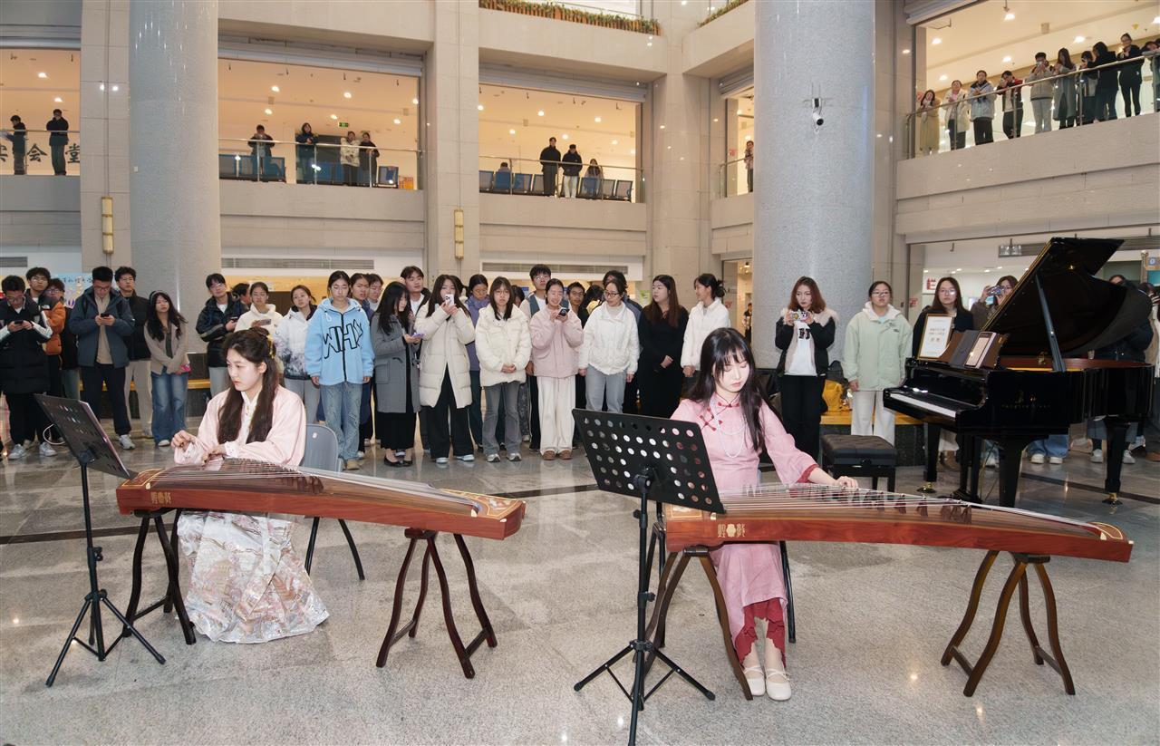 “铮铮……”古筝二重奏《春有百花》的旋律率先响起,演奏者全情投入,指尖流淌出的音符仿佛将春日的生机带入了冬夜的图书馆。乐师张格尔深情地说道:“再次演奏这首曲子,心中感慨万千。希望同学们能坚定地走过这个冬天,在春天如愿以偿见证百花盛放。”