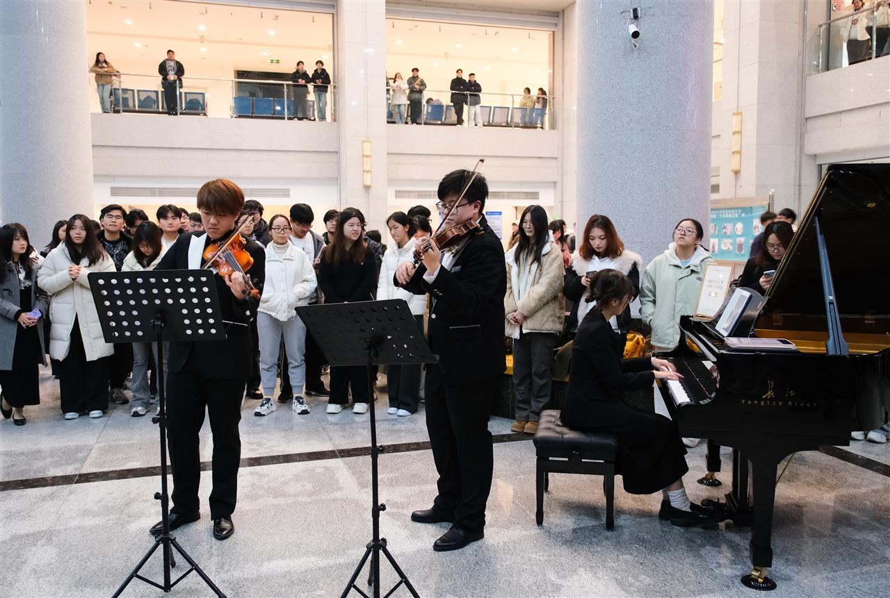 12月18日晚,夜色渐深,武汉科技大学黄家湖校区图书馆内依旧灯火通明。对于正在备战考研的学子而言,这本是一个寻常的奋斗之夜,但当闭馆时刻临近,一场意想不到的“书韵流响”音乐会打破了紧张的备考氛围。悠扬的旋律在满室书香中流淌,为正在最后冲刺的考研学子们送去了一份特别的“心灵SPA”。