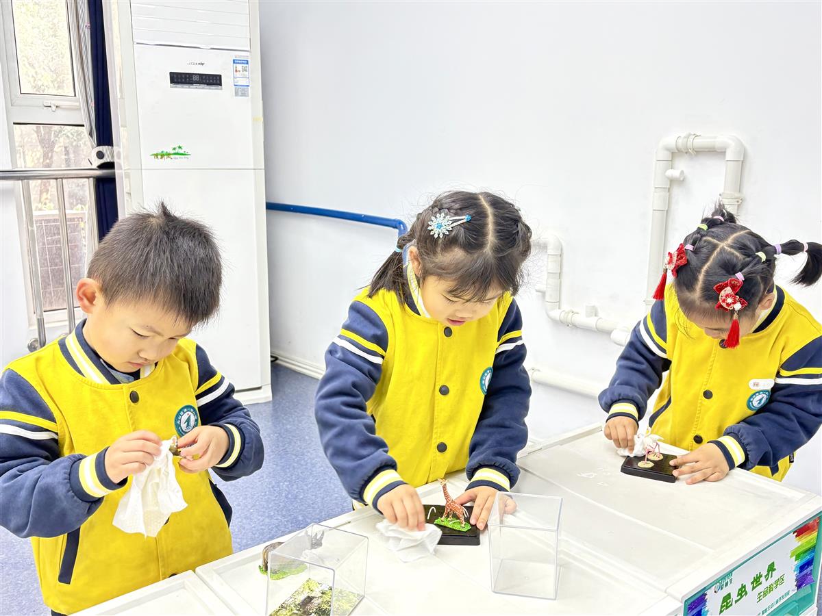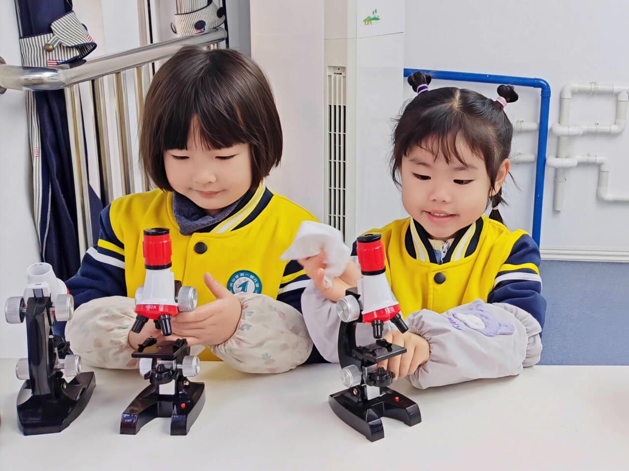 盥洗室里,套着蓝色袖套的孩子们正围在水池边,小手握着水杯反复搓洗,水流打湿了袖口,却挡不住他们专注的眼神;活动室里,几个孩子围坐一起,将积木按形状分类入盒,遇到体积大的积木还会互相搭手,合作的模样引得老师频频微笑;科学馆内,孩子们则化身“小研究员”,小心翼翼地擦拭显微镜镜头,动作轻缓生怕碰坏“宝贝”。“我洗的水杯最干净,老师说这样喝水才健康!”刚完成任务的中二班小朋友小茉莉举着水杯向同伴“炫耀”,小脸上满是成就感。