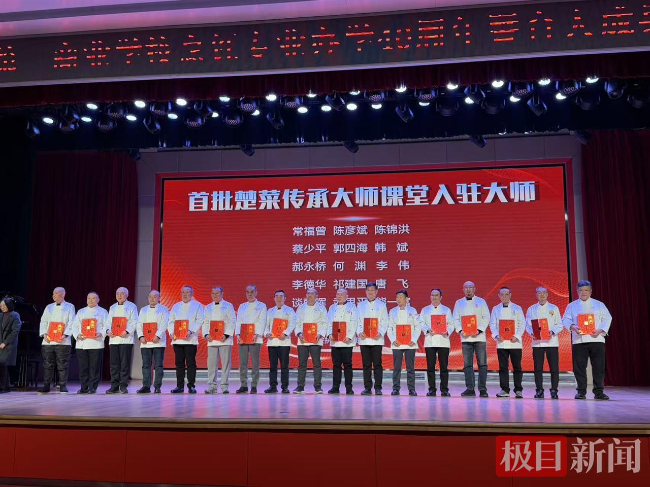分享会现场,武汉市教育局职业教育与成人教育处处长王小东为卢永良、孙昌弼、余明社、涂建国四位楚菜大师颁发了“终身荣耀导师”聘书。此外,该专业还启动了“楚菜传承大师课堂”,二十余位一线楚菜大师集体受聘,组成“大师天团”常驻校园,将行业最前沿的技艺与标准系统化、常态化地带入教学一线,让原汁原味的楚菜技艺得以薪火相传。