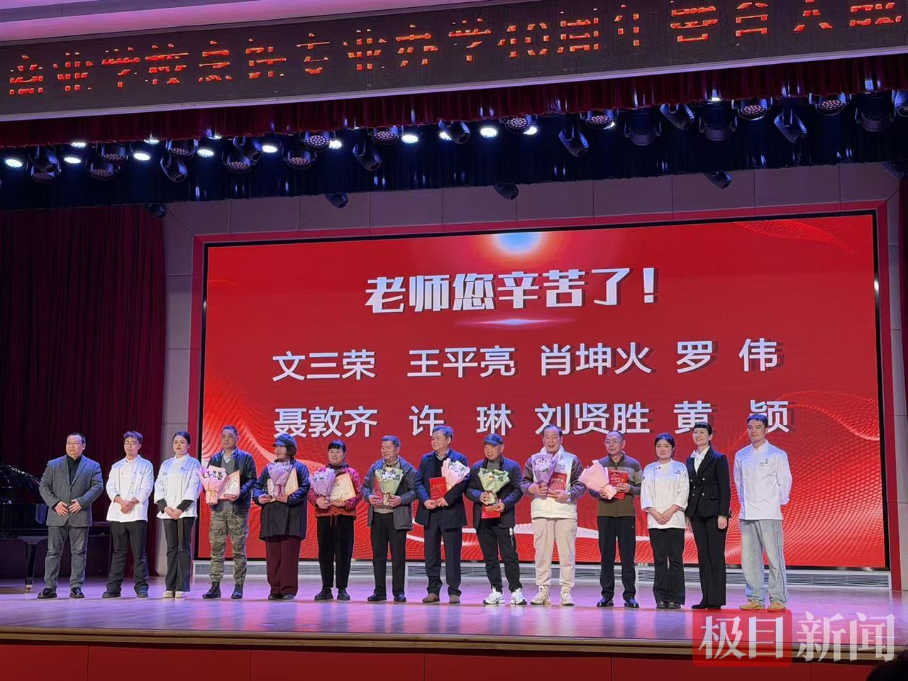 况野老师、常福曾老师、文三荣老师三位资深教师相继登台,分享了他们在三尺讲台与一方灶台间的耕耘岁月。他们谈及如何手把手教会学生第一道拿手菜,如何将“做菜如做人”的朴素道理融入日常教学,言辞恳切,满是热爱与坚守。随后,武汉市第一商业学校党委书记艾翠林、校长鄢鸣共同为教师代表颁发了纪念牌,表达了对教师们辛勤付出的感谢与敬意。