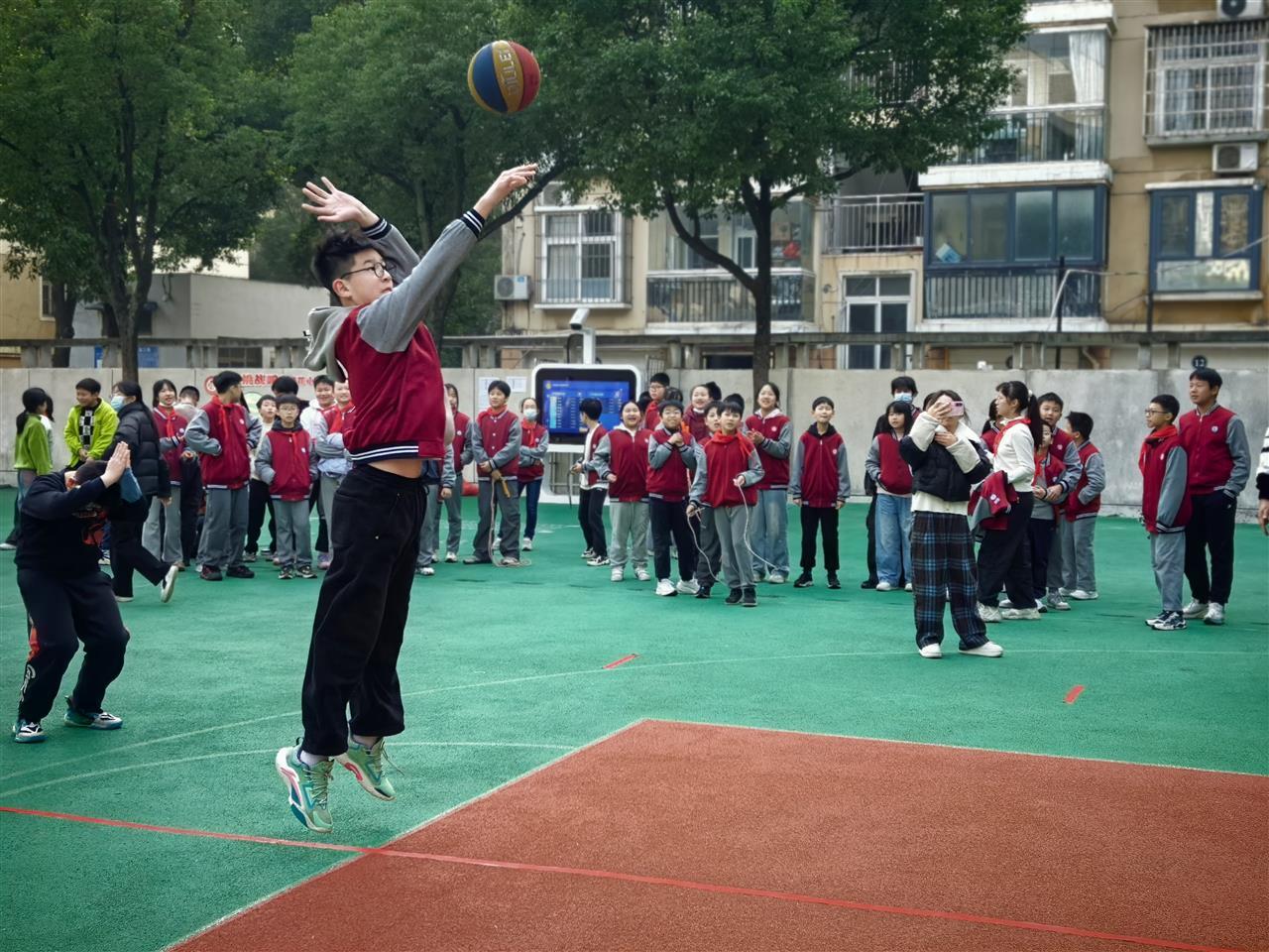 活动前期,学校结合两校区场地特点与各年级学生体能差异,精心设计梯度化赛事体系。低年级以并脚跳短绳、钻山洞、赶小猪等趣味项目为主,注重基础体能与协作体验;中高年级设置单脚交换跳短绳、双摇跳绳、篮球投篮等技巧型项目,强化竞技性;“8”字跳长绳、跑操比赛等集体项目贯穿全程,兼顾全员参与与团队凝聚力培养。让活动既有挑战,又充满乐趣。