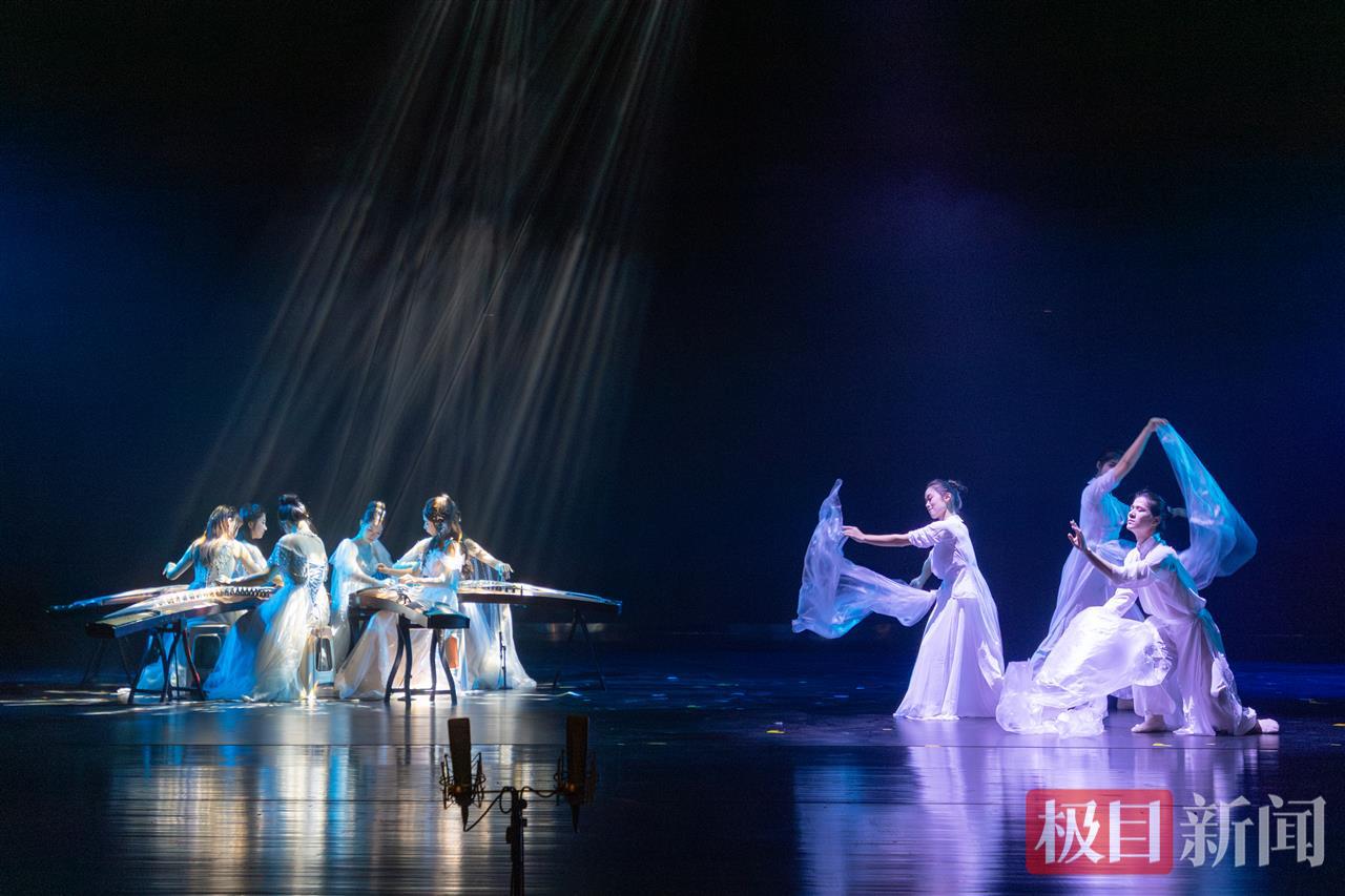 在“湛”的篇章,整个舞台成了自由的画卷,演员与观众尽情享受此时的自由与安稳。舞蹈演员身着水墨服装伴随弦乐起舞,《兰亭》通过筝音与舞蹈的对话,勾勒出水墨兰亭的千年雅韵;大提琴的音色与古筝相碰撞,《蝴蝶与蓝》的乐声像蝶翼轻触碧波湖面,舞台自然流淌出深邃的乐声。