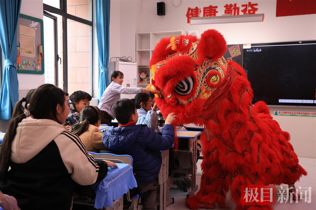 随后的舞狮表演将气氛推向高潮。由武汉工商学院精英龙狮社4名大学生扮演的两只“狮子”活灵活现,穿梭于课桌之间,孩子们笑声不断,纷纷上前与“狮子”亲密互动,现场气氛热烈。