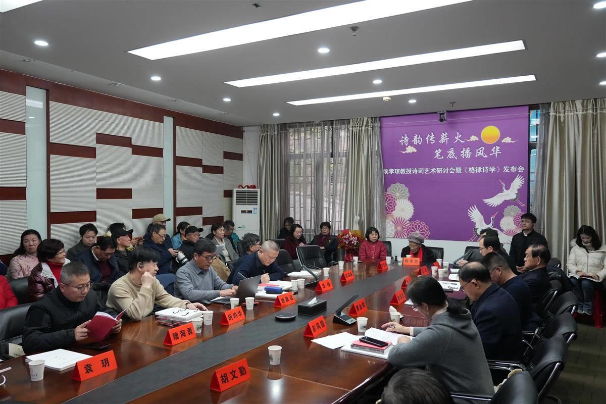 这并非寻常生日聚会,而是由湖北省中华诗词学会主办、大地行吟诗社承办的“侯孝琼教授诗词艺术研讨会暨《格律诗学》发布会”中的温馨环节——同侪后学以诗、书、画、乐、诵等形式,向寿星敬献贺礼。