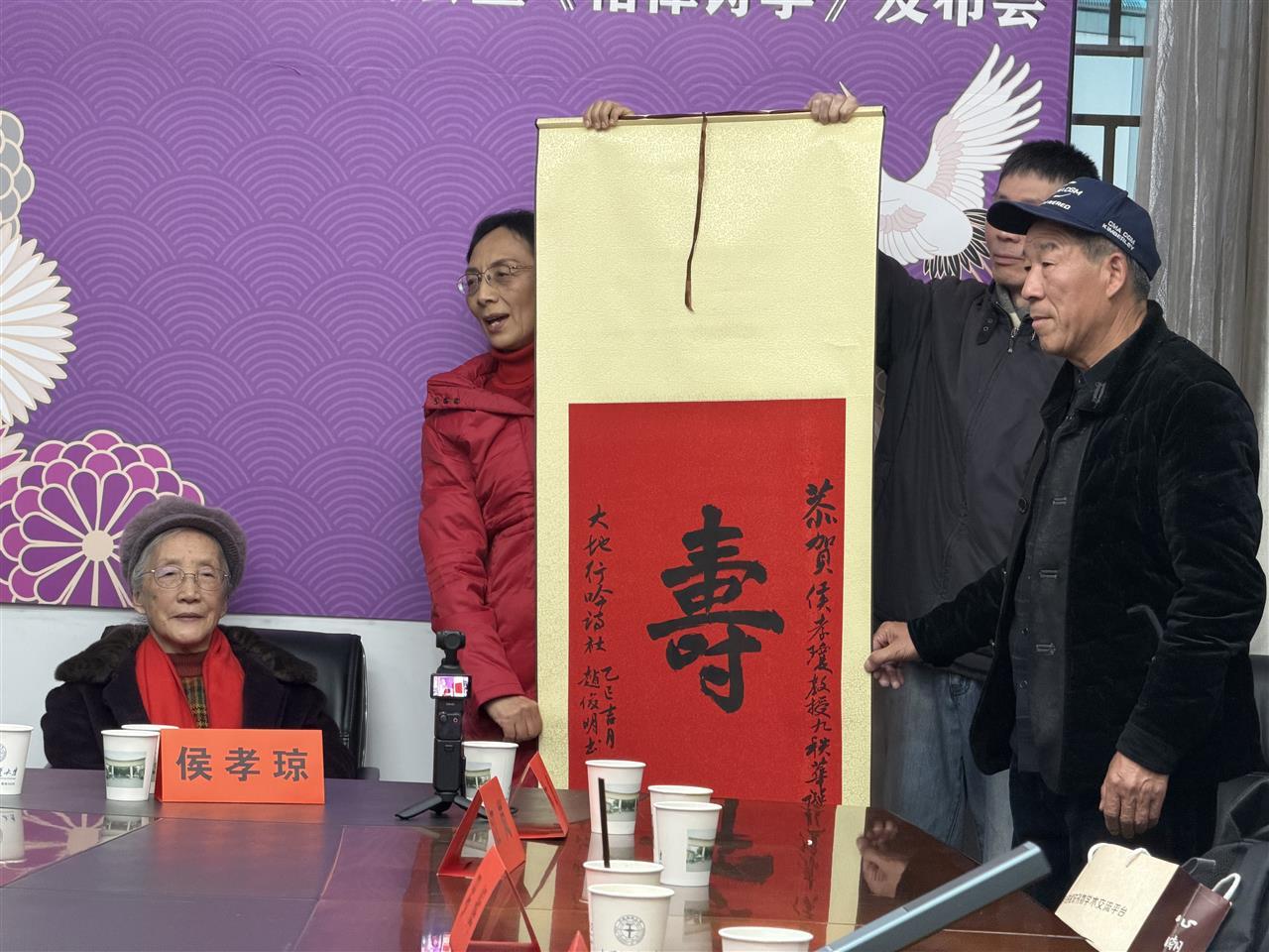 诗社成员秦红献上自创自书的诗作,高声吟诵:“九秩弦歌半陌春,诗心雅韵胜家珍……”他将一位退休后因热爱诗词而甘当“小学生”的仰慕与祝福,融入墨迹与韵律之中。诗社成员赵俊明亦奉上以大幅“寿”字为主题的书法作品,以笔墨传递敬意。