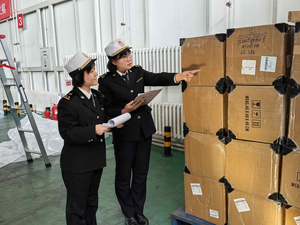 哈尔滨太平机场海关关员对国际“空空转运”货物开展监管作业