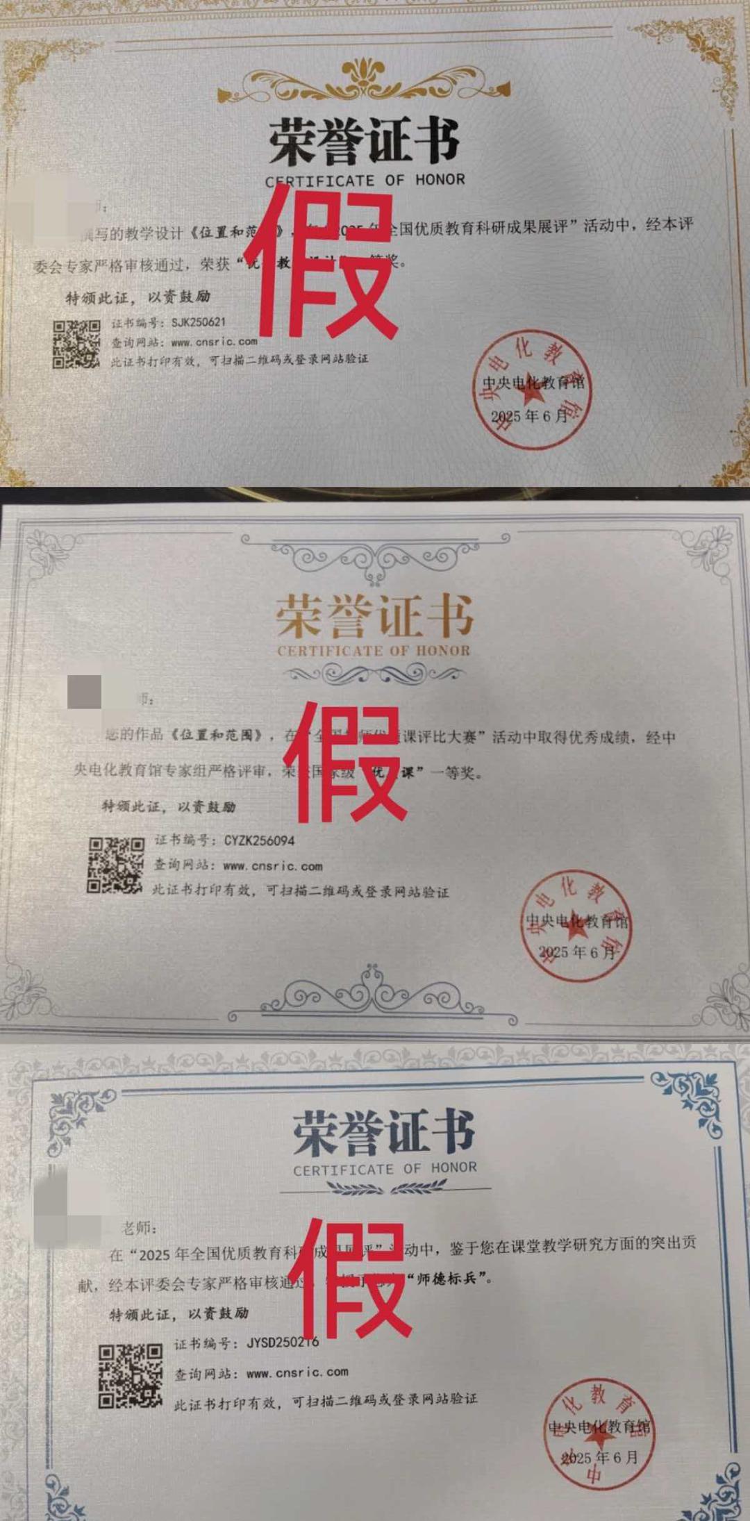 目前发现的有标注为“2025年全国优质教育科研成果展评”活动的“师德标兵”证书、“优秀教学设计”一等奖证书,标注为“全国教师优质课评比大赛”的“优质课”一等奖证书(相关假证信息附后),上述假证所附查询网站(网址:www.cnsric.com)系假冒网站,其相关行为严重侵害我中心合法权益。
