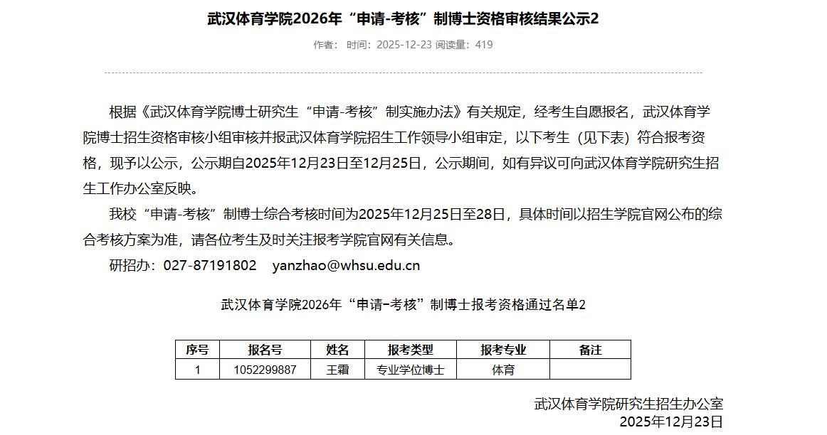 12月23日,武汉体育学院研究生院官网发布公示,女足运动员王霜已经通过该校2026年“申请-考核”制博士资格审核,报考类型为专业学位博士,报考专业为体育。