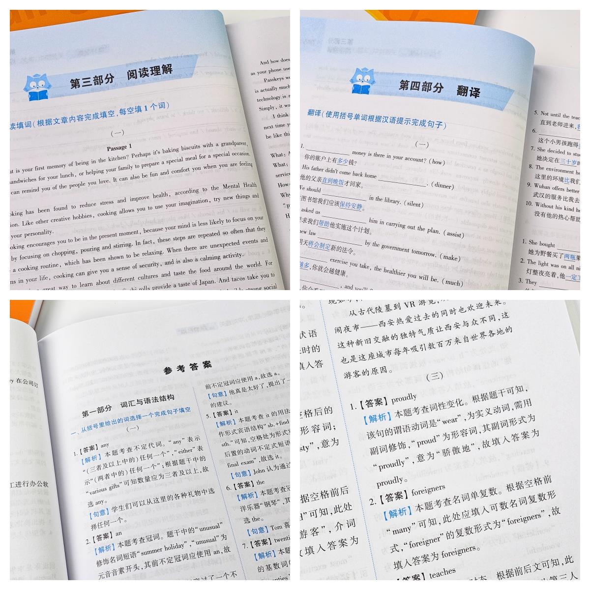 值得关注的是,题库突出“实战导向”特色。书中不仅收录了短文填空、连词成句、阅读理解、翻译填空和写作的全部题型,还针对这些题型配备了详细解析,以帮助考生明确解题思路与得分要点,大幅提升冲刺阶段的复习效率。