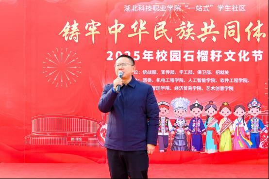 “太震撼了!我还是第一次见到有这么多同学自发排起长队参加一场校园活动,更没想到校领导会走进队伍和我们一起跳舞,是真正的一家人!”近日,湖北科技职业学院“一站式”学生社区“铸牢中华民族共同体意识校园‘石榴籽’文化节”现场,学生方靖的话立即引起了周围同学的共鸣。随着《最炫民族风》的欢快旋律,学校党委副书记何平与身着各民族服饰的同学们手拉手共舞,不远处副校长周得力举着红彤彤的糖葫芦与学子亲切合影,温暖场景点燃全场热情,一场兼具视听盛宴与思政温度的文化盛会就此拉开帷幕。