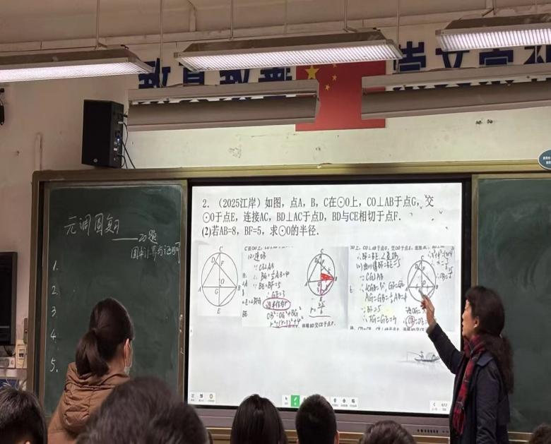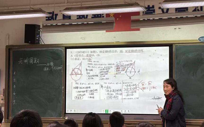 下午2时,周映红老师聚焦圆的元调复习专题,以学生思维突破关键题型为核心,呈现了一堂针对性极强的示范课。课堂上,周老师精准把握学情,针对中等生易错痛点题型深入剖析,通过条理清晰的知识梳理、层层递进的例题引导,助力学生突破思维瓶颈;同时紧扣几何书写规范,结合学生答题问题对照历年真题标准答案细致讲解,帮助学生精准定位失分点。整堂课设计精巧、节奏紧凑,尽显优秀教师扎实功底与高效课堂魅力,两校听课教师认真记录、收获颇丰。