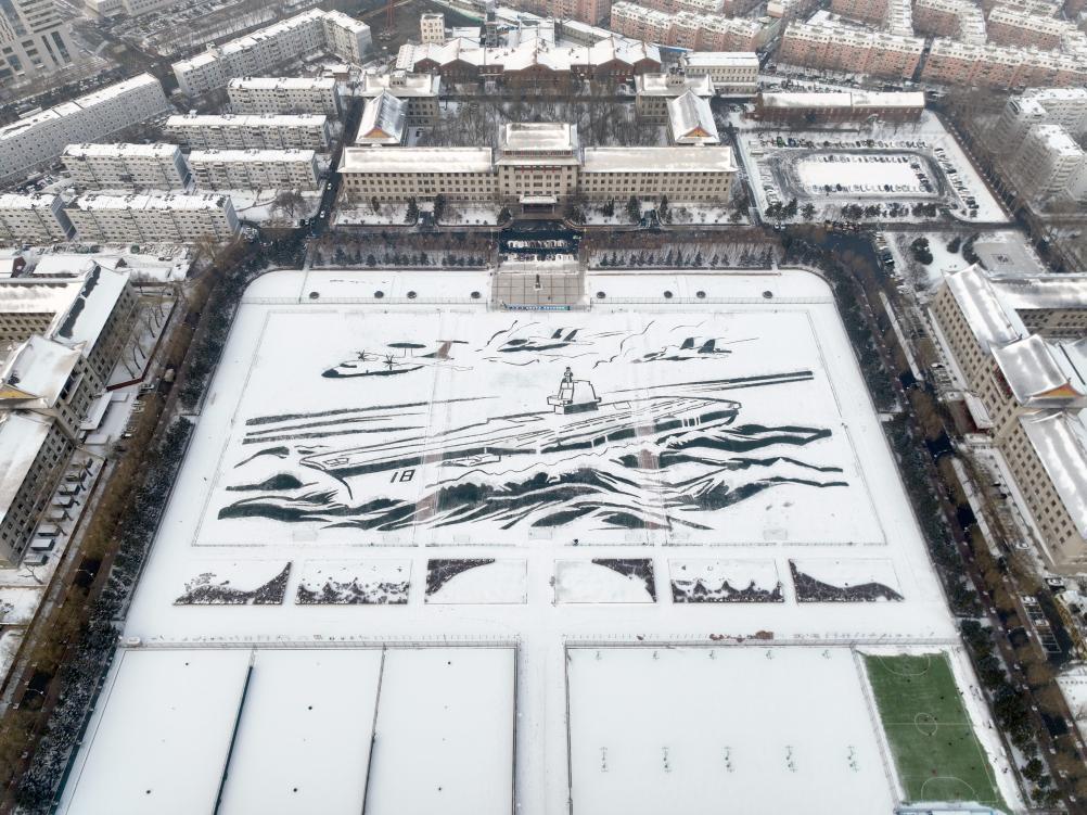 哈工程千余师生在军工操场上绘就雪地航母。新华社发