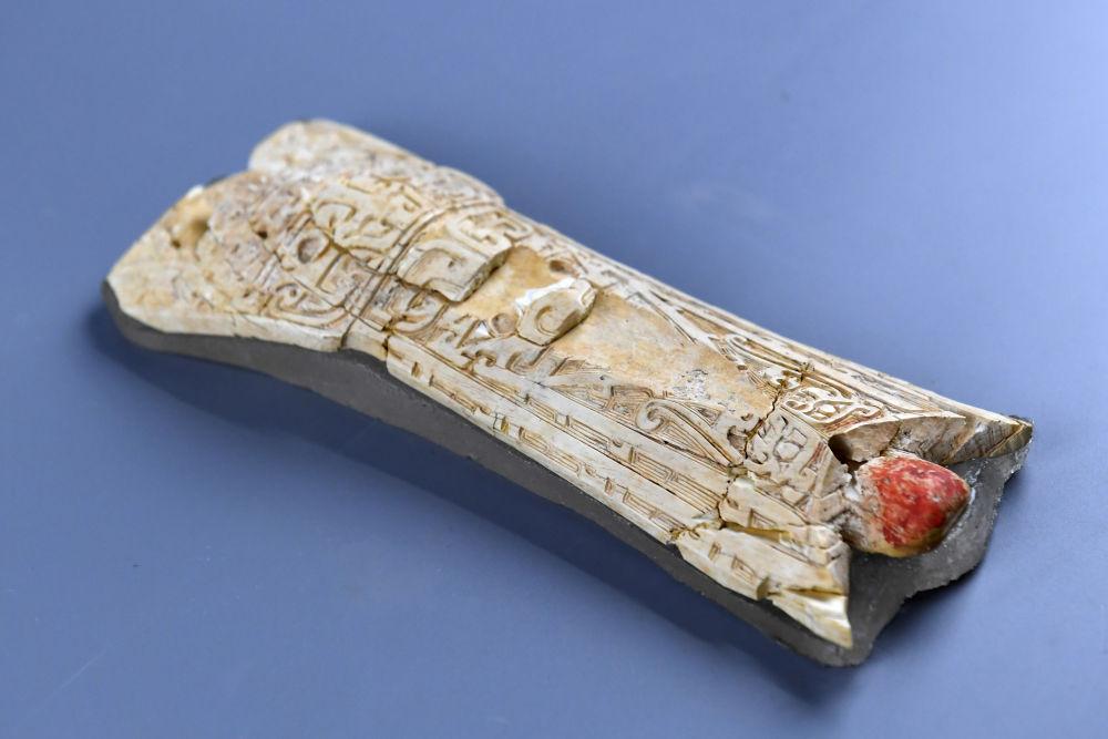 这是陕西清涧瓦窑沟墓地出土的雕花象牙器(2025年12月8日摄)。新华社记者 李一博 摄